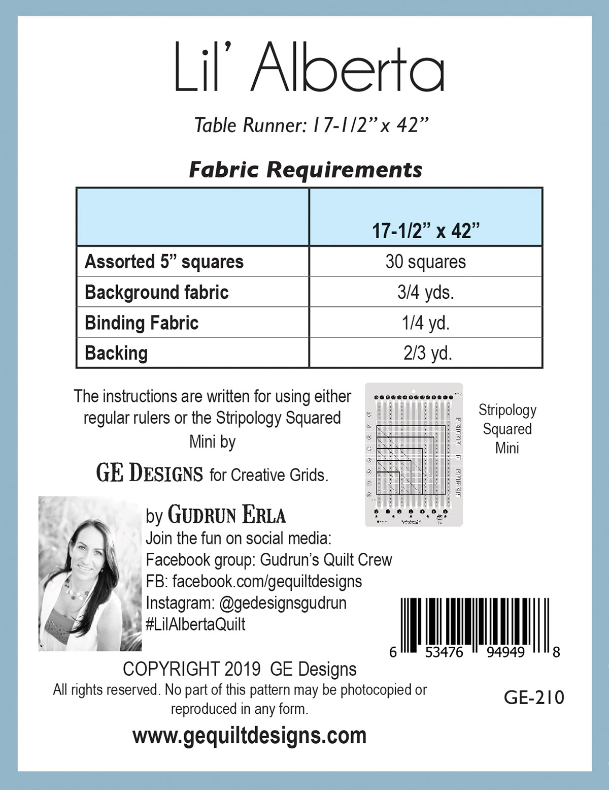 This table runner is much easier to make then it looks using the Stripology Squared Mini Ruler and 5" fabric squares, plus some background. Full color instructions include how to use regular rulers as well. Size 17-1/2" x 42".