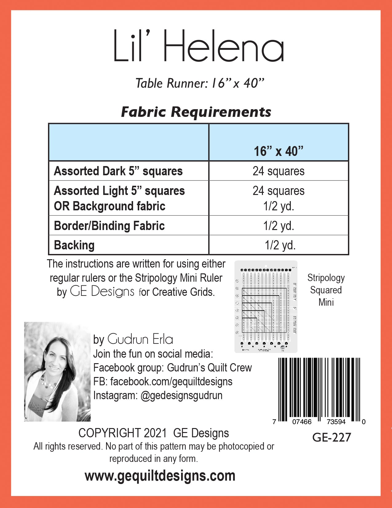 Easier than it looks, darling Lil' Helena is made with 5" squares of dark and light fabrics, a border fabric and the Stripology Squared Mini Ruler. Full color instructions include how to use regular rulers as well. Size 16" x 40".