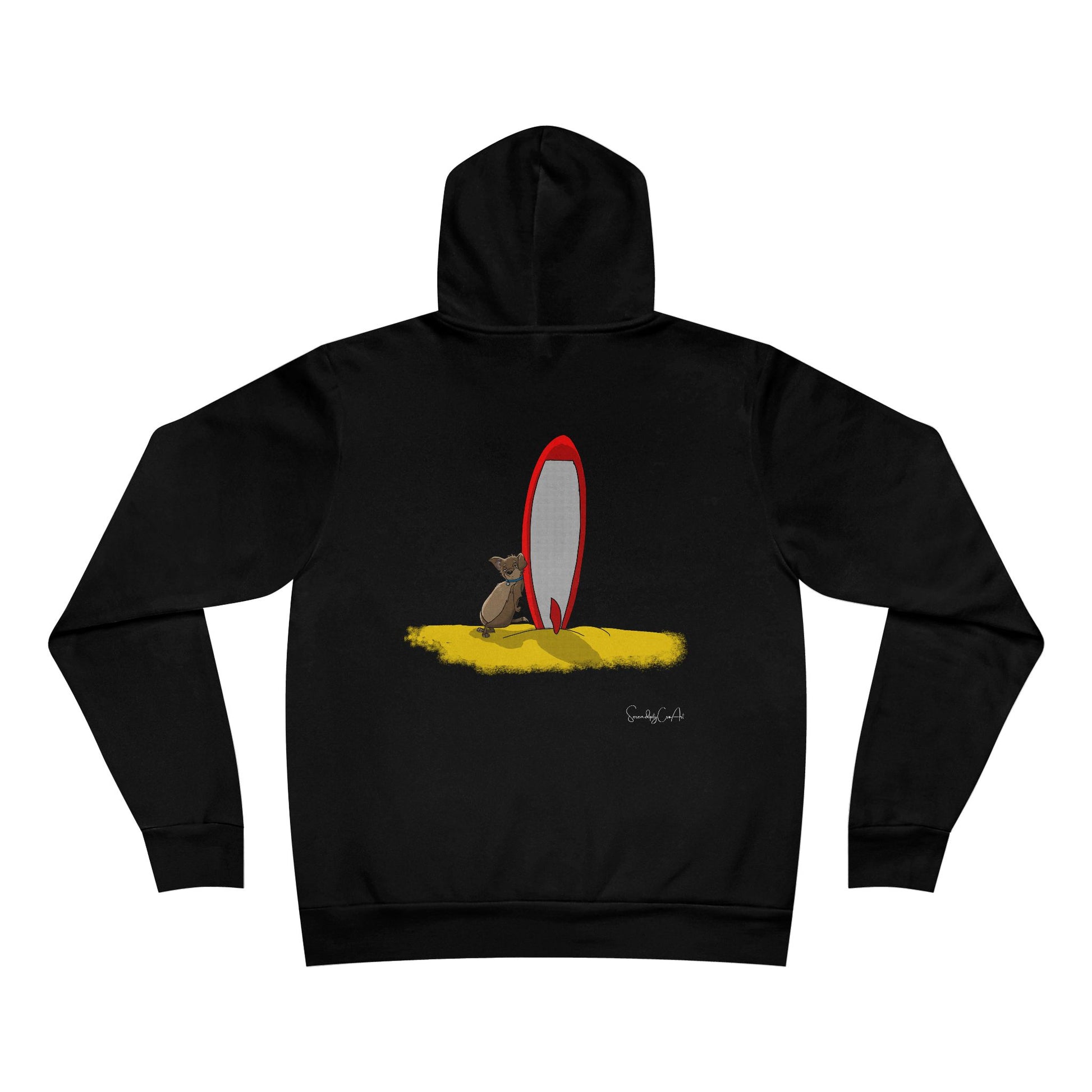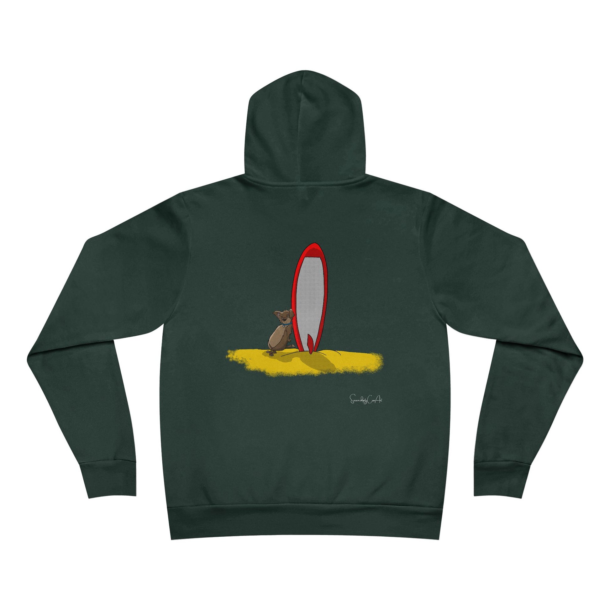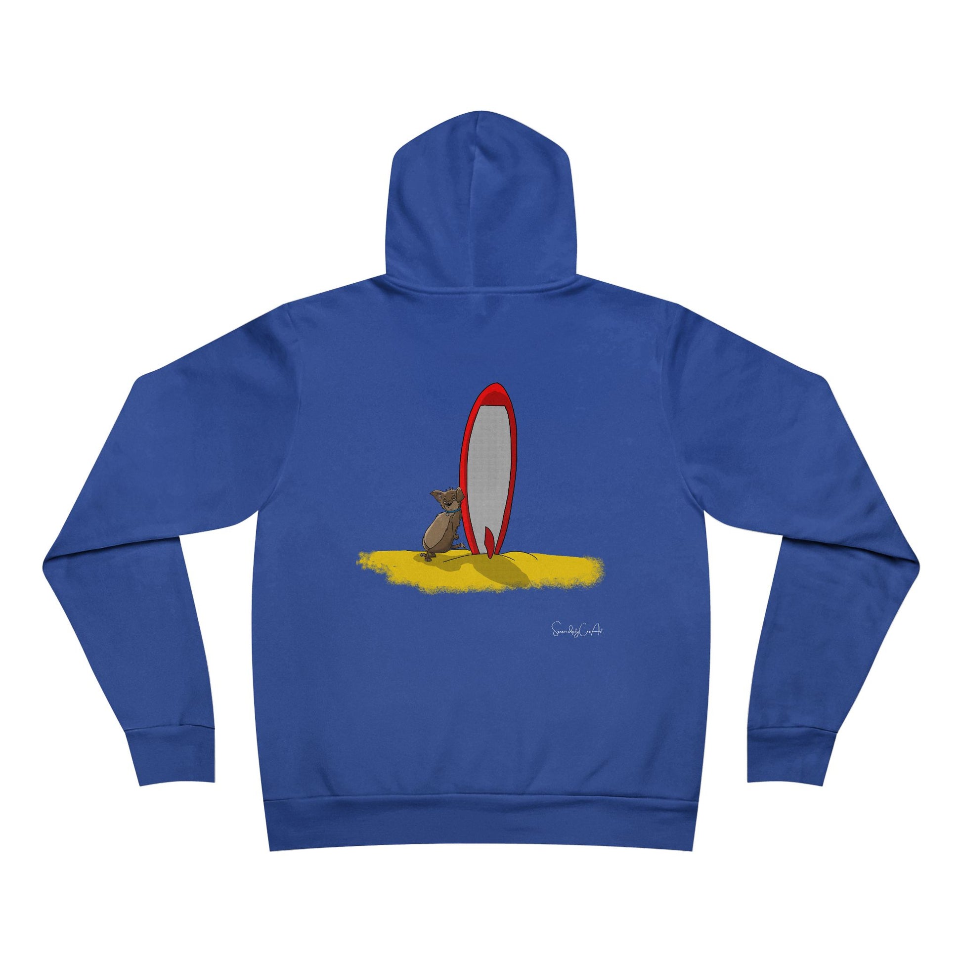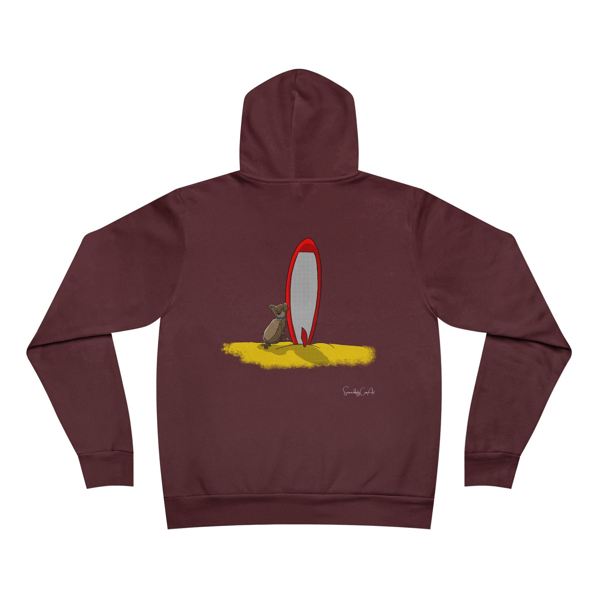 The unisex sponge fleece pullover hoodie is a blend of Airlume cotton and polyester. The percentages vary according to color. A pouch-style pocket spreads across the lower half of the garment’s front. The hood can be tightened with a white drawcord. Both cuffs and waistband have ribbing for extra grip.